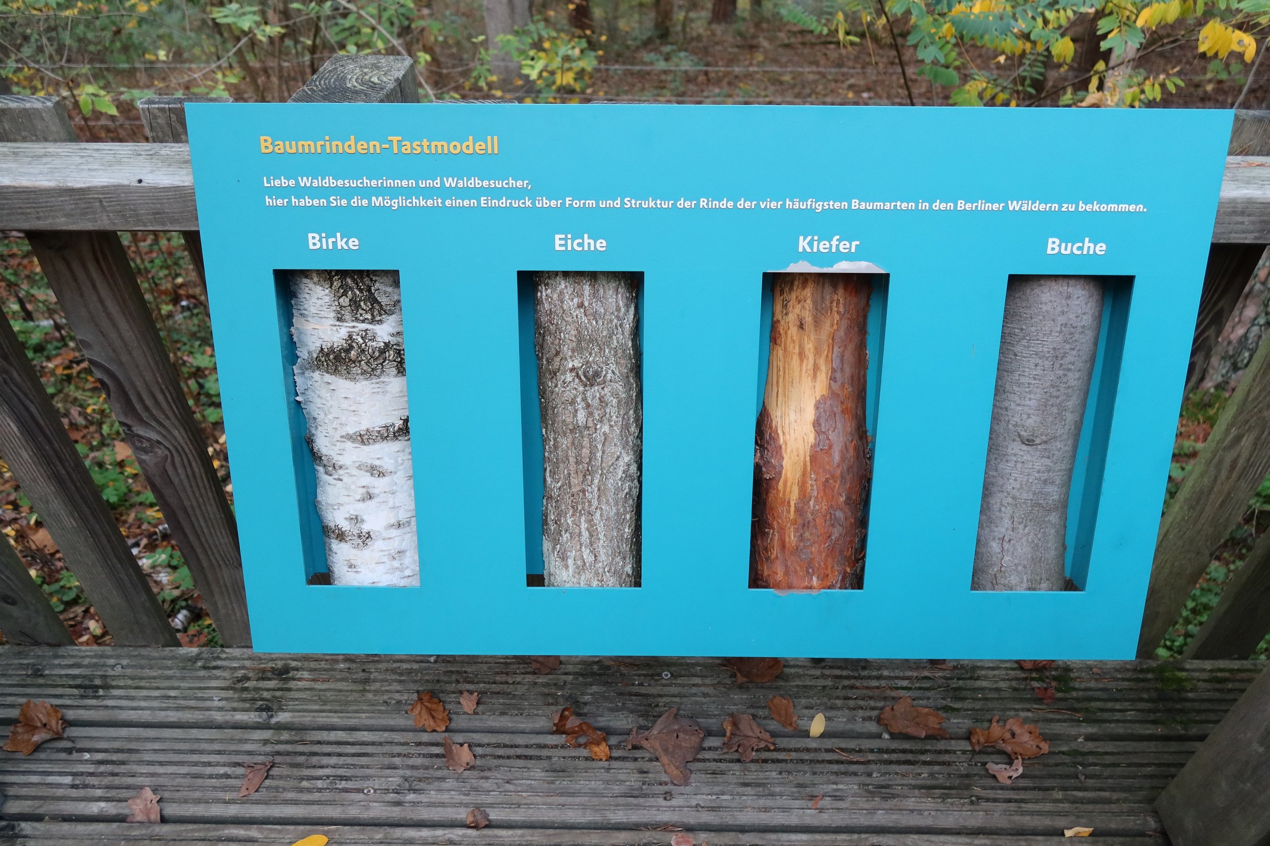 Art piece from the outside exhibition, showing what Berlin’s forest are consisting of: 60% pine, 21% oak, 10% other deciduous trees, around 5% other conifer trees, and 4% beech